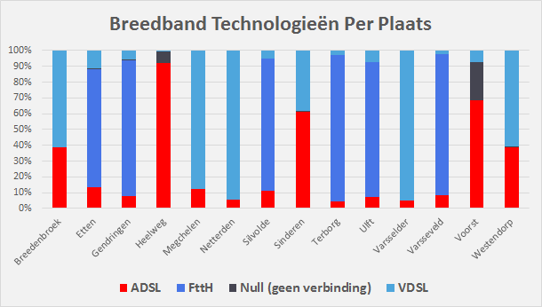 De volgende grafiek geeft een overzicht voor de veertien kernen. In het grafiek, “Null” betekent dat er (volgens KPN) geen internet dienst via een vaste verbinding mogelijk is, en “FttH” (Fiber to the Home) betekent een breedband verbinding via Glasvezel.