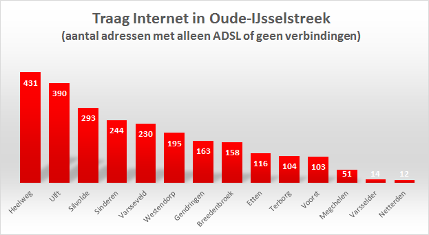 De meestal adressen in buitengebieden In Oude IJsselstreek hebben alleen ADSL infrastructuur met laag internetsnelheid en sommige hebben niks, alleen telefoon dienst over versleten koperen KPN-kabeltjes van 60 jaar oud.