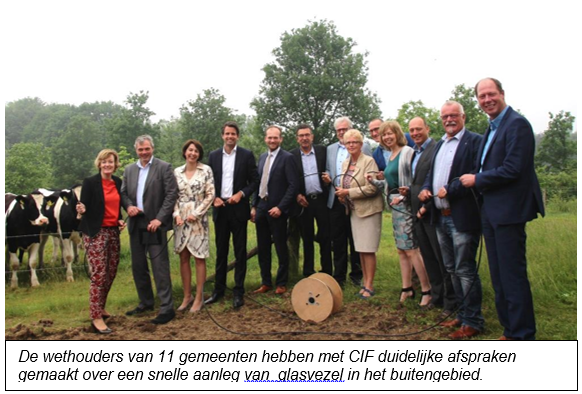 De acht Achterhoekse gemeenten maken samen met Doesburg, Zutphen en Lochem haast met de aanleg van glasvezel in het buitengebied. Met CIF, het bedrijf dat de glasvezel aanlegt, zijn goede afspraken gemaakt over een snelle aanleg van de glasvezel. Direct na de zomervakantie begint de aanleg in Berkelland en Winterswijk wanneer minimaal de helft van het aantal huishoudens een abonnement afneemt. Naar verwachting ontvangen alle inwoners van het buitengebied in deze 11 gemeenten vóór de zomer van 2017 een aanbod voor de aanleg van glasvezel.